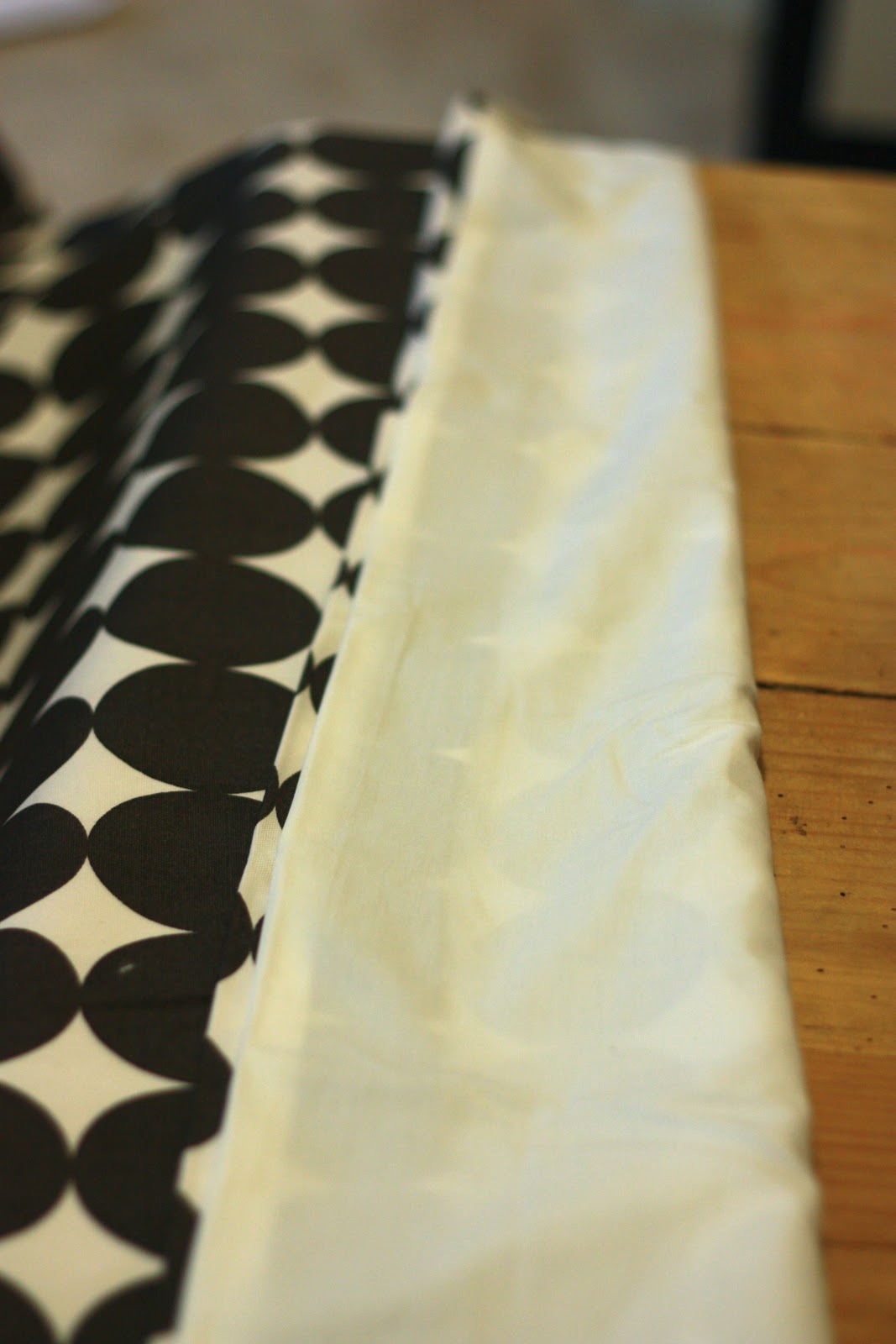 For the back side of the blanket, I found a sheet set at Bed Bath and Beyond that matched the cream almost exactly. It was on clearance, and I had a coupon. Yep, I was pretty excited to text Cassi and tell her the back of the cover would only run her $10.00! Unheard of. Once the front was pieced, I simply serged around three edges, right sides together (like making a gigantic pillow case). For the bottom, I hemmed the Dwell dots, and left the original sheet hem for the bottom. Then I folded them both under, to create a faux seam.