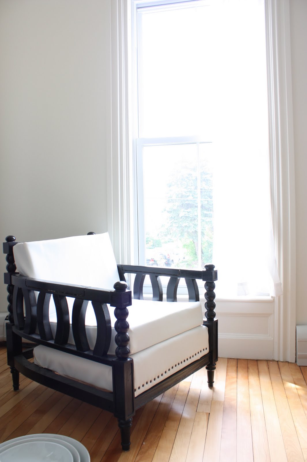 What a beauty, eh? See those good bones? I love the curved lines and stacked-ball legs on the frame. And it’s deep seat makes for a very comfortable sit! The newly finished hardwood and extra long New England windows of our apartment didn’t hurt much, either:)