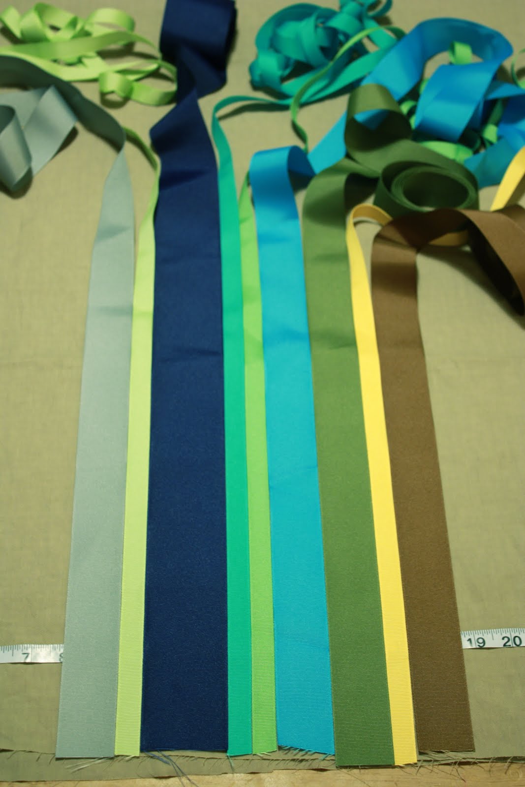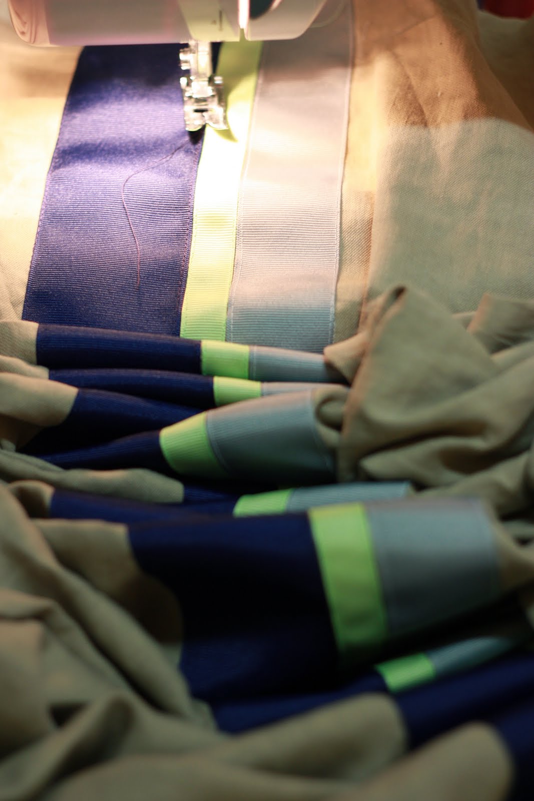 Three yards of perfectly neutral linen and three yards each of several hand-picked colors and widths of grosgrain ribbon. I lined them all up 8″ from the top of the linen, and played around with order until I got it just right.