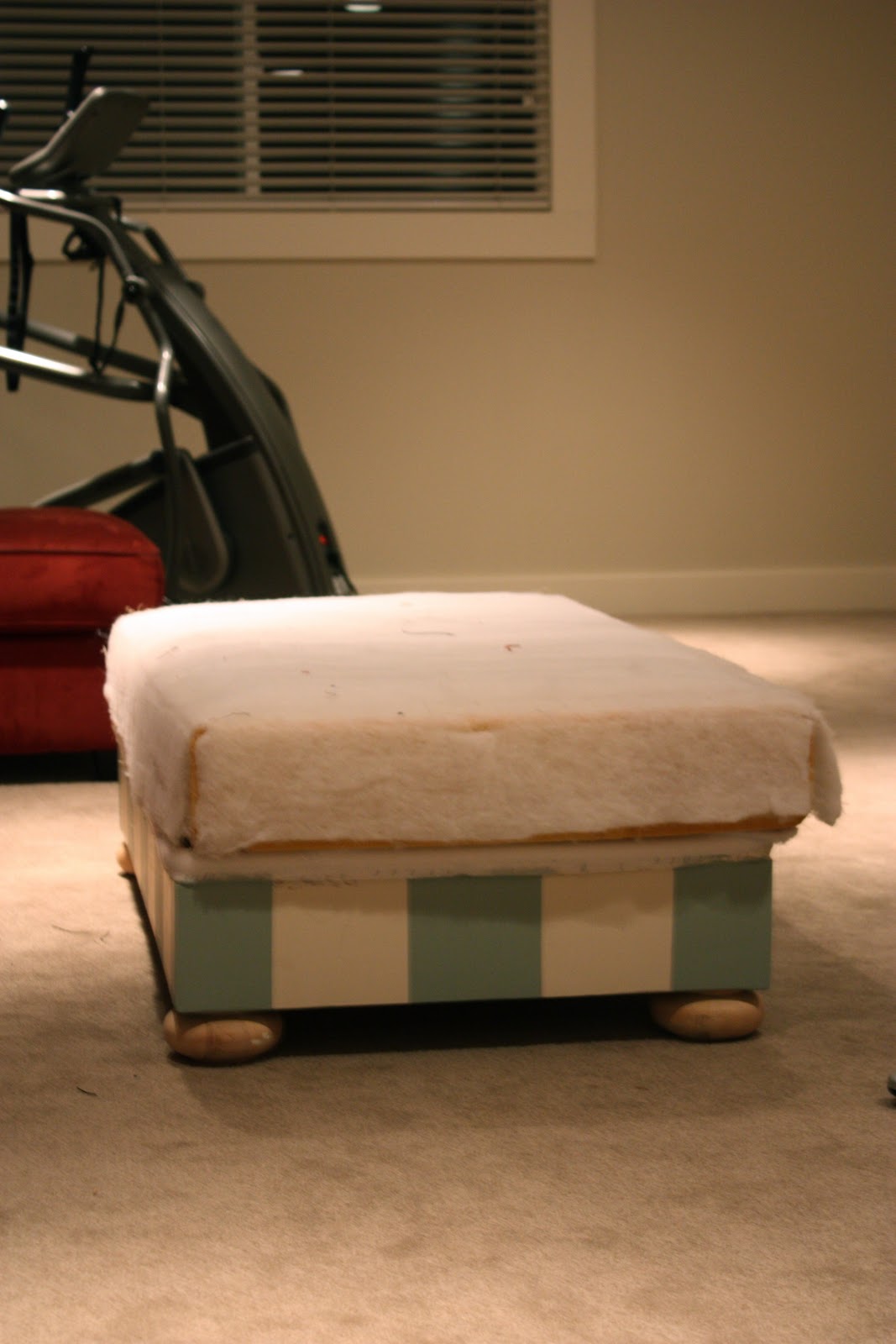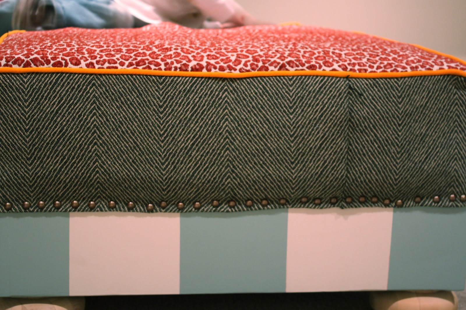 We decided we liked the wood frame on the bottom, and I suggested stripes. After tearing away fabric, and removing a million staples, Melanie was able to mud, sand, prime and paint these adorable stripes! Blue and beige. Perfect. The feet will be orange, but that will be the last step.
